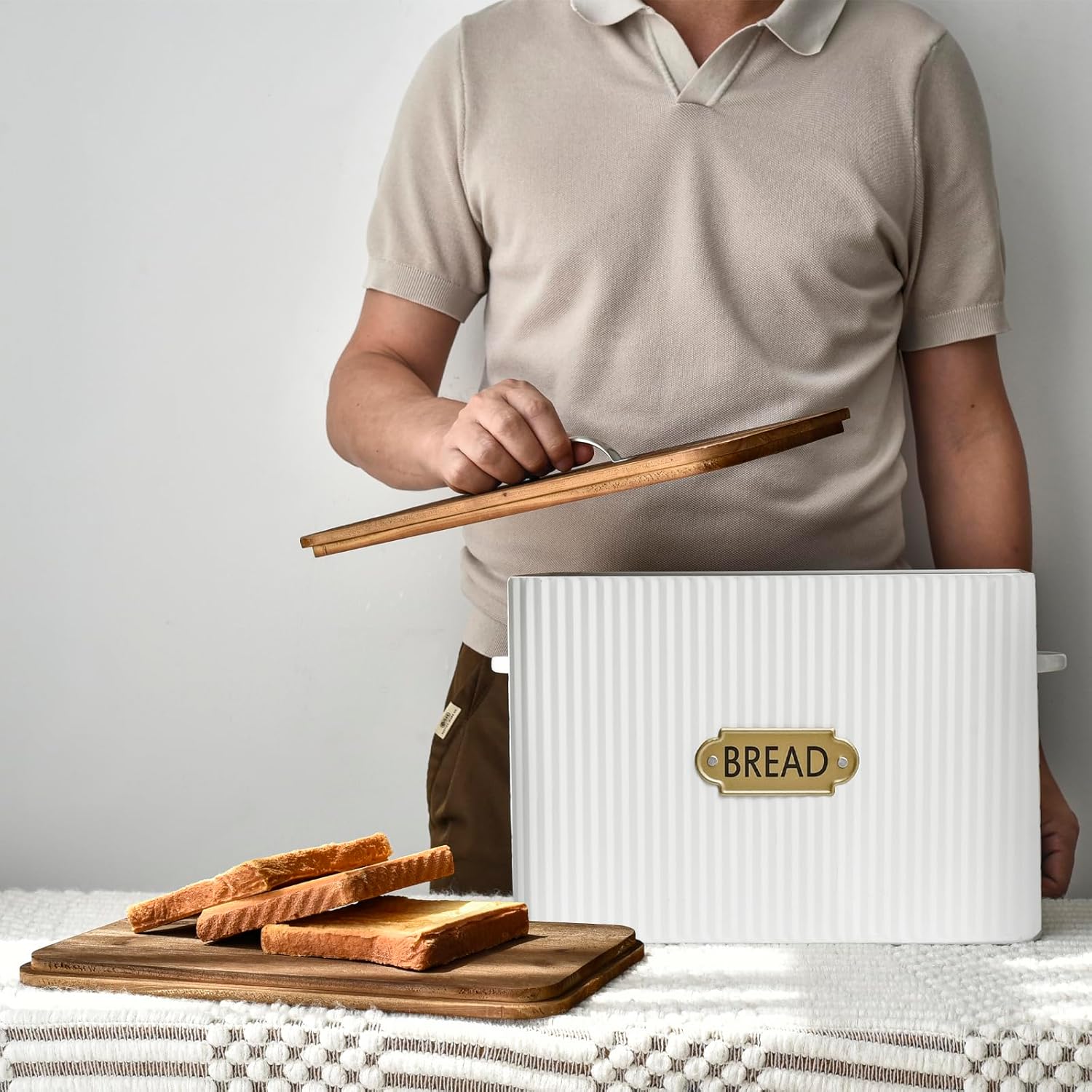 - Charming Farmhouse Design: Elevate the aesthetic of your kitchen decor with the charming farmhouse design and rustic wooden lid of our bread box. It's not just a bread holder; it's a statement piece that adds a touch of country styling to your space.