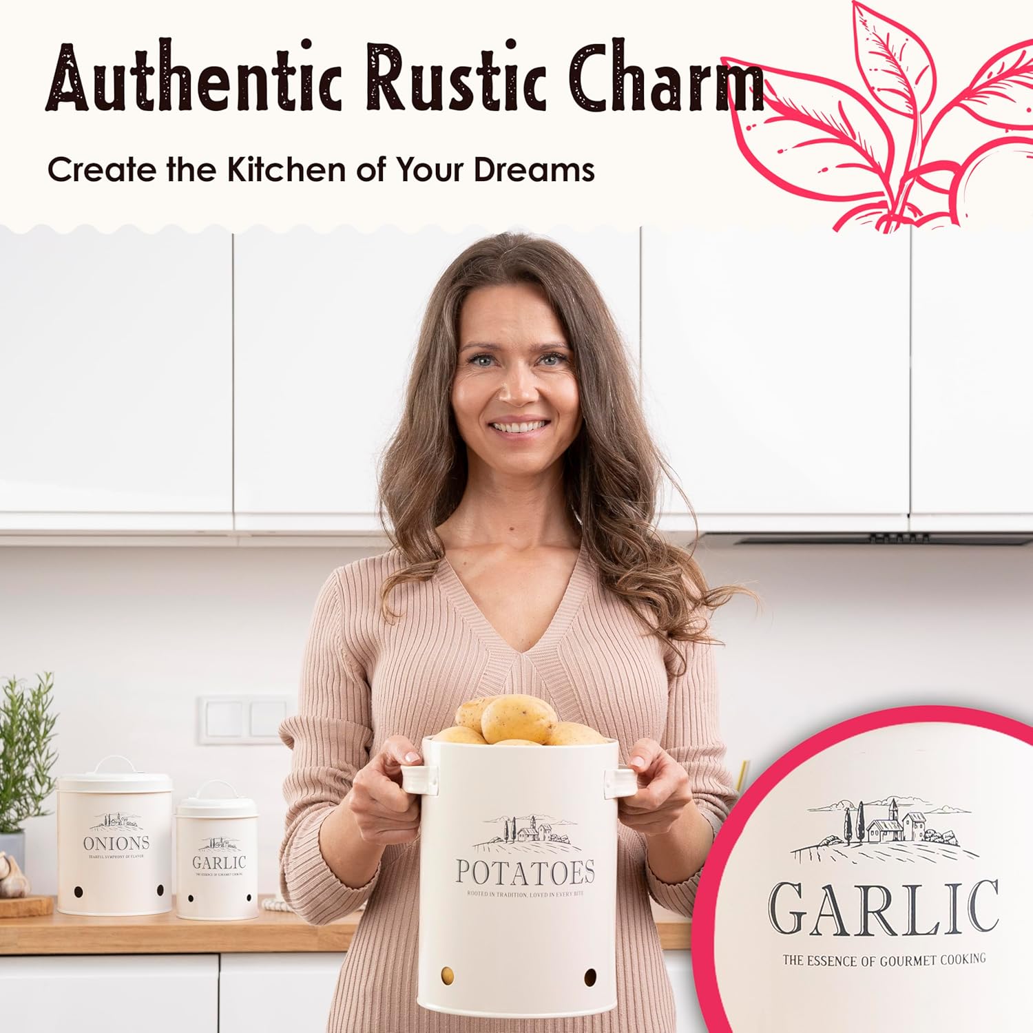Potato and Onion Storage Bin Set – 3 Metal Farmhouse Canisters with Ventilation Holes – Rustic Kitchen Organizer for Garlic, Onion, and Potato Storage – Countertop or Pantry Use