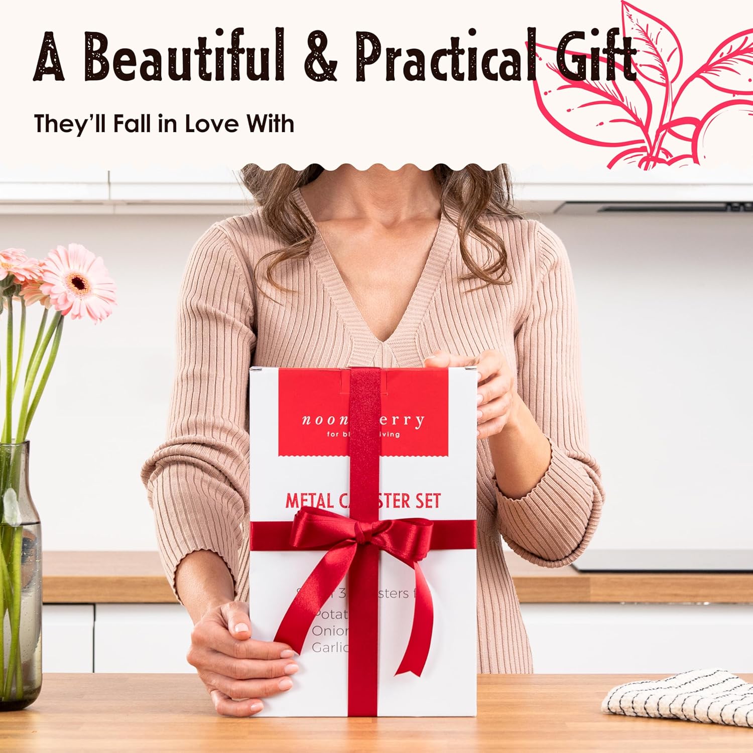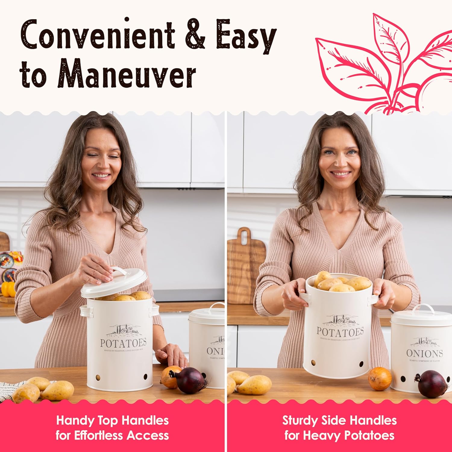 - Durable, Convenient & Easy to Handle: Genuinely unique, high-quality pieces designed to stand the test of time. Lightweight steel containers are food-safe, rust-proof, and easy to wash by hand. The canisters feature easy-to-lift top handles, while the potato bin includes sturdy side handles for easy maneuvering, even when filled with heavy potatoes