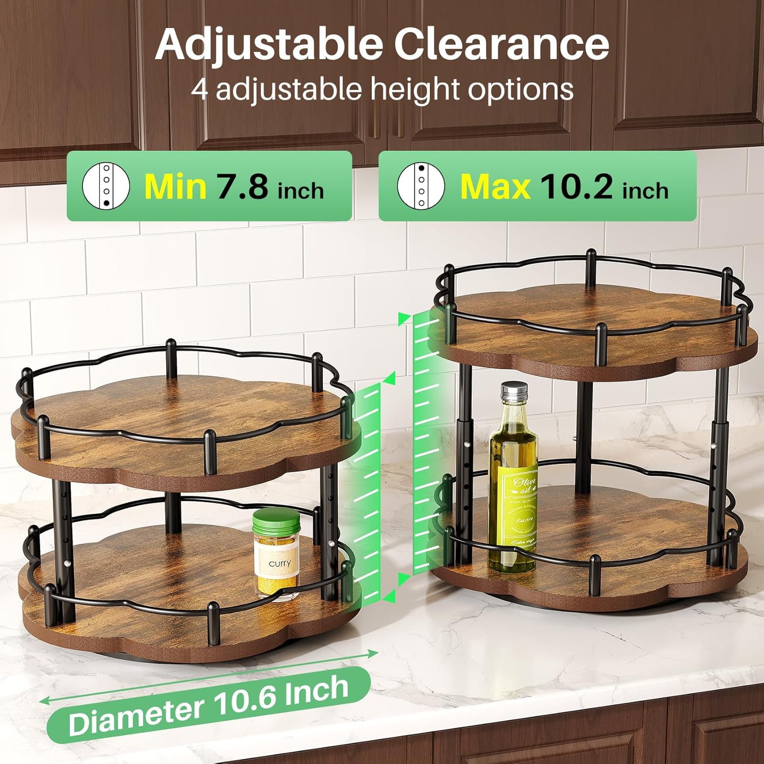 Lazy Susan Spice Rack Organization for Cabinet - 2 Tier Adjustable Height Lazy Turntable Spice Organizer for Kitchen Countertop & Pantry, Wood 10 Inch Seasoning Storage, Black