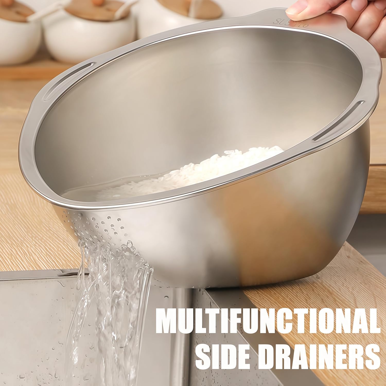 - Quick Drainage Colander Strainer: Equipped with fine drainage holes on the side, this stainless steel washing bowl ensures quick water drainage while preventing food from falling through.