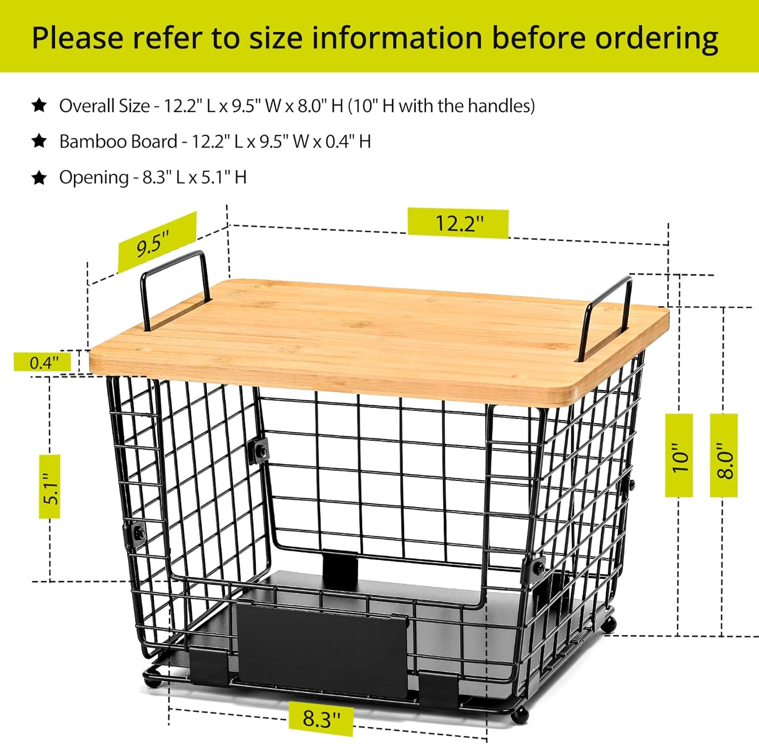 - ★DIMENSIONS - The overall size of the L LARGE black wire basket is 12.2" L x 9.5" W x 8" H(10" H with the handles). The size of the Bamboo board is 12.2" L x 9.5" W x 0.4" H. The size of the opening is 8.3" L x 5.1" H.