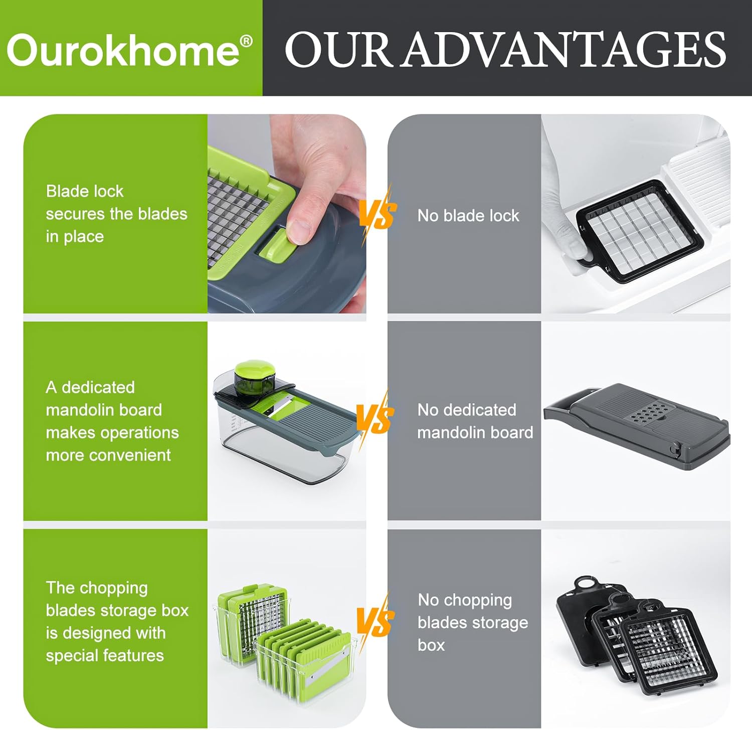 - A kitchen essential gadgets - The expanded hand guard ensures the safety of your fingers, while its detachable design facilitates easy cleaning. Whether you're a novice cook or a seasoned pro, the Ourokhome 8 in 1 food chopper is a must-have in any kitchen. It's versatile, easy and safe to use and store, and backed by our 100% satisfaction guarantee.
