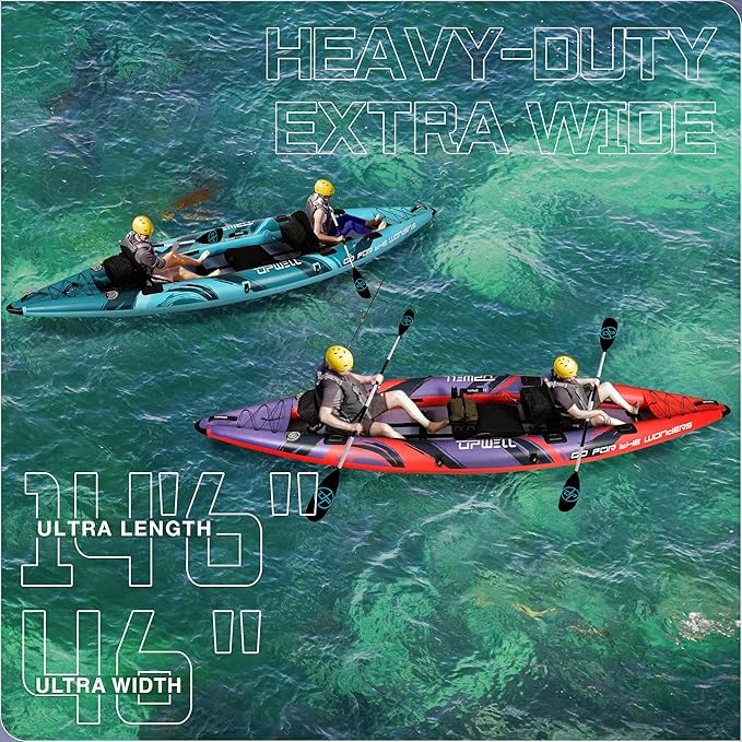 • PROFESSIONAL 2+1 DESIGN:The inflatable recreational kayak from UPWELL, it's 14'6" long x 46" wide x 12" height, weighs 40 lbs. The weight capacity up to around 700 lbs, making it lightweight for portability and especially suited for two or more who needs a tandem. The inflatable kayak is designed for all skill levels to explore in different areas for traveling and touring