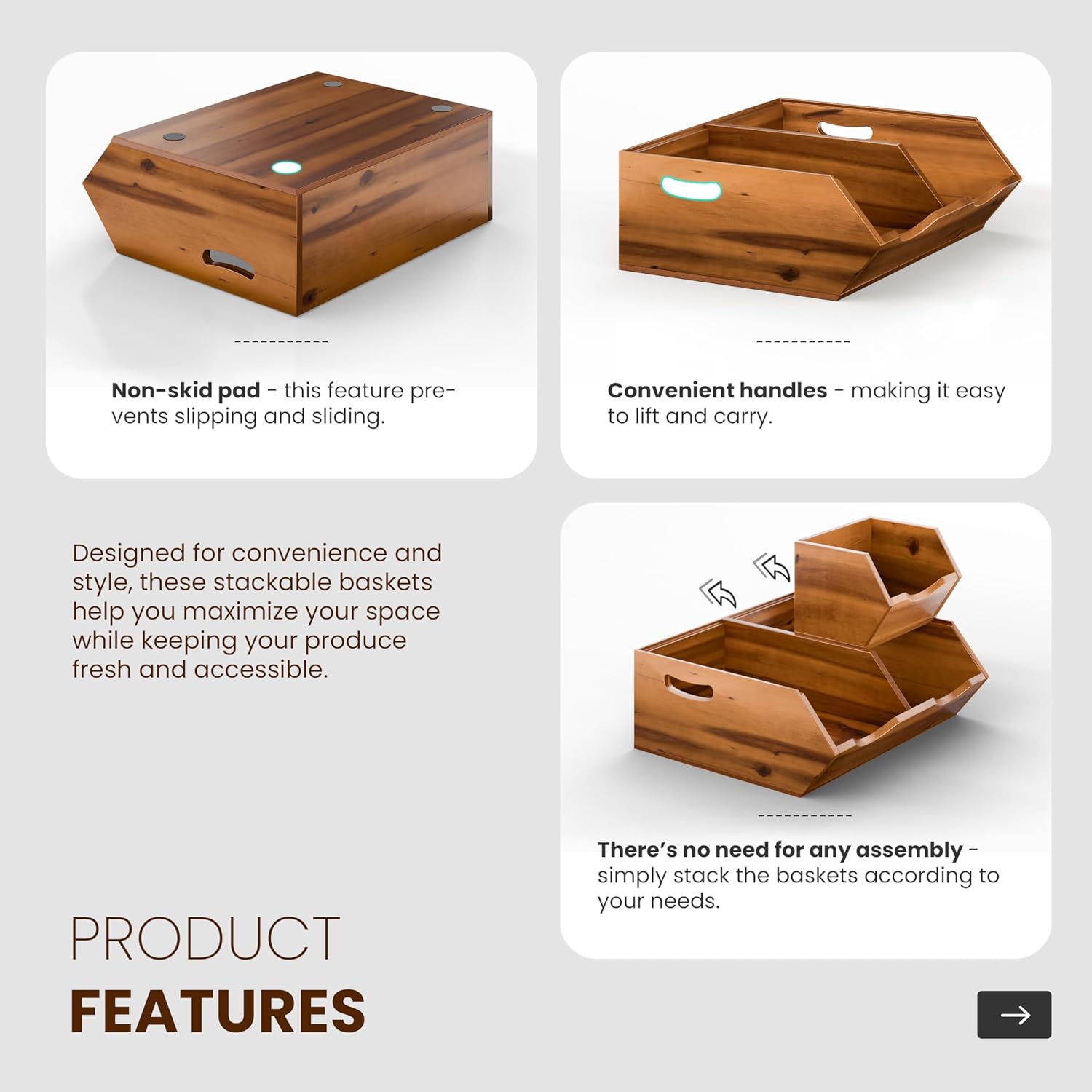 HOLANA Onion and Potato Storage Bins - Acacia Wood Pantry Baskets Organization and Storage - Wooden Stackable Baskets for Bread, Fruit, Vegetable - Onion Basket for Kitchen Counter (Patent Pending)