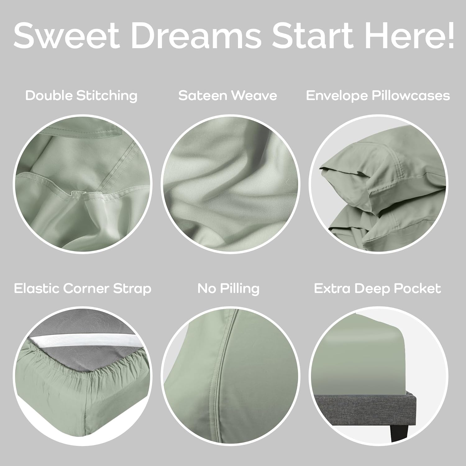- Tired of Waking Up to Messy Bed Sheets? Our cal king fitted sheet with corner straps features an 18" deep pocket california king sheet set design, perfect for your king mattress, while our envelope closure pillowcases keep pillows securely in place.