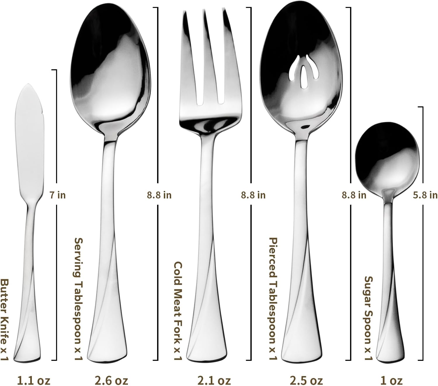- INCLUDES: 65-piece flatware set with service for 12. Set includes 12 each: dinner knife, dinner fork, salad fork, dinner spoon and teaspoon. Plus 1 each:serving tablespoon, pierced tablespoon, cold meat fork, butter knife, and sugar spoon