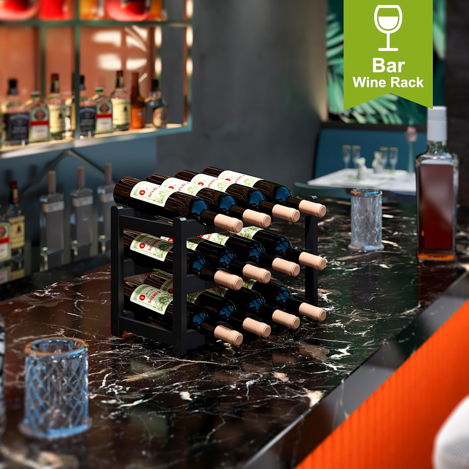 BMOSU Bamboo Wine Rack Wine Storage Cabinet Shelf 12 Bottle Wine Racks Countertop Sturdy for Kitchen Dining Room Pantry - 3 Tiers Wine Rack (Black)