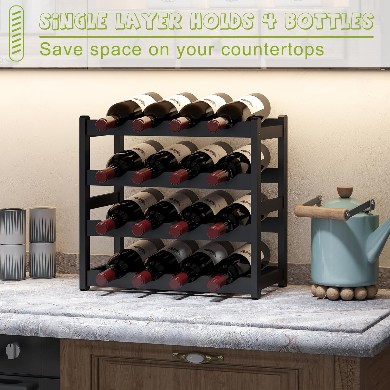 BMOSU Bamboo Wine Rack Wine Storage Cabinet Shelf 16 Bottle Wine Racks Countertop Sturdy for Kitchen Dining Room Pantry - 4 Tiers Wine Rack(Black)