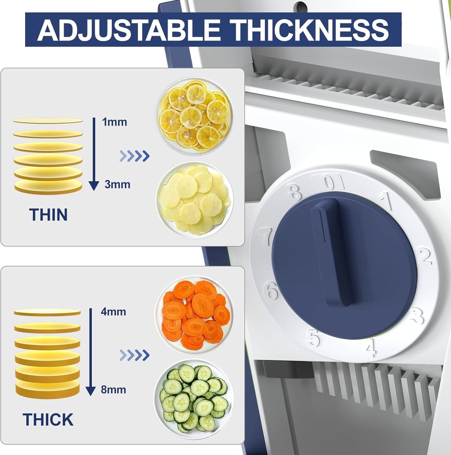 - 【Safe Mandoline Slicer】 The newly Upgraded Vegetable Slicer have larger feeding port & container chopper more food at once.We have all the slicing optiones build in the mandoline slicer.Rotary the switch to change the cutting options, No need to touch the blade ever,In addition, our Vegetable Chopper is easy to install and clean, making it a great companion for your daily cooking.