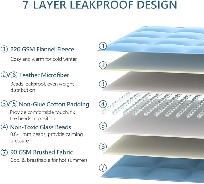 • Easily Care & Machine Washable: This 5 lb weighted blanket is easy to clean and maintain. It can be machine washed or tumble dried. We recommend washing in cold water and tumble drying or air drying on low. No bleaching or ironing is required.The 7-layer design and tight alignment stitching prevents beads from leaking, so you can use it with confidence. We provide a full range of considerate service, if you have any questions about our adult weighted blanket, you can ask us at any time