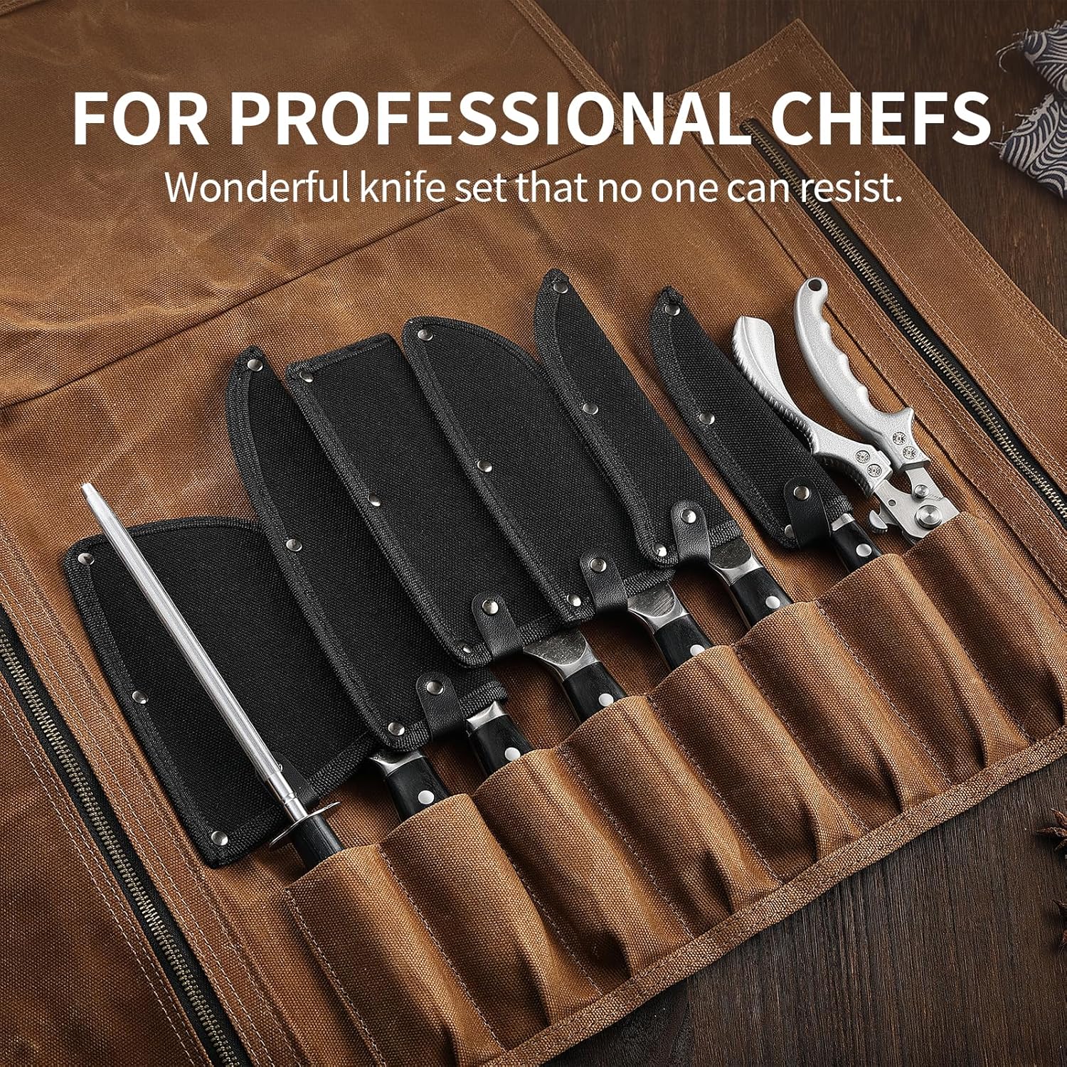 - Special Knife Bag: XCHIEF PRO knife bag is made of high-quality canvas and leather and come with a special design. Unlike other knife bags, which can only hold knives and not even other accessories. The XCHIEF PRO bag not only holds all 6 knives, poultry scissors and honing steel, but also has two zippered pockets of different sizes to organize all the necessary items. It is much more practical!