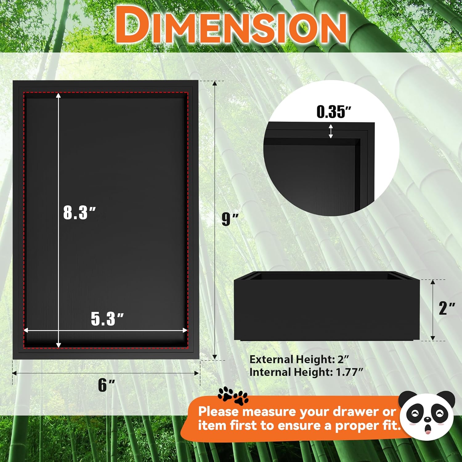 - Each bamboo drawer organizer measures: external size: 9" L x 6" W x 2" H; internal size: 8.3" L x 5.3" W x 1.77" H. Please check the size before purchasing