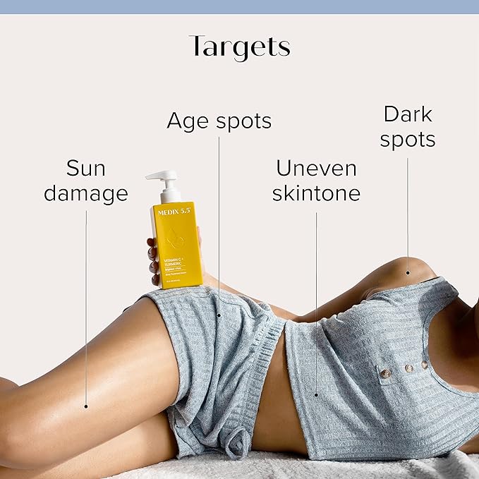 • RADIANT SKIN โ€“ Medix 5.5 Vitamin C Cream Brighten + Firm Body Lotion is formulated with the perfect combination of effective anti aging + brightening ingredients, including Shea Butter, Aloe Vera, Ferulic Acid, Turmeric, Vitamin E, Glycerin, Ginger, & More. Shea Butter deeply moisturizes the skin, improves elasticity, & provides a protective barrier to help prevent moisture loss. Vitamin E helps protect skin against free radicals + UV Damage. Aloe Vera helps calm + hydrate the skin.