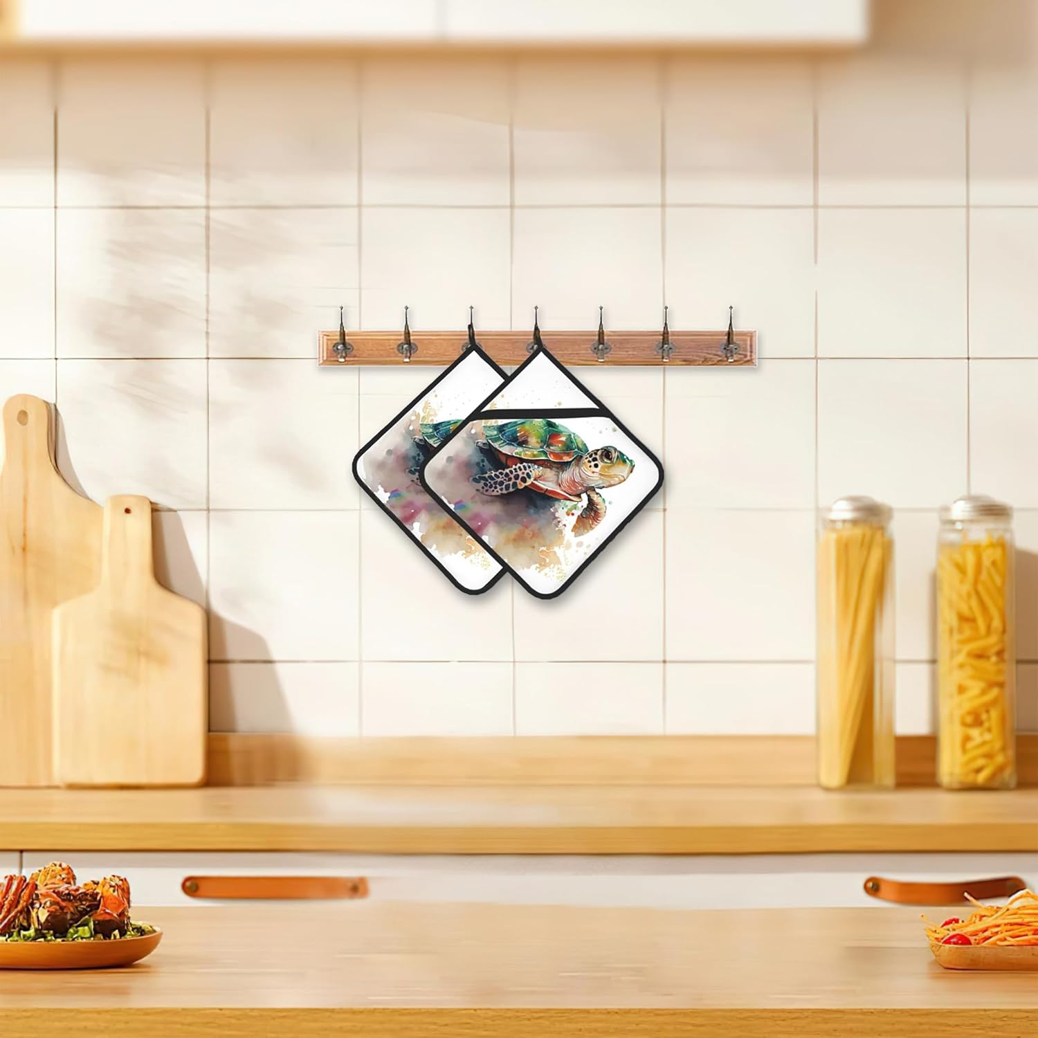 2PCS Turtle Watercolour Pot Holder with Loop,Heat Resistant Oven Pads,Hot Pat for Kitchen Cooking Baking Food