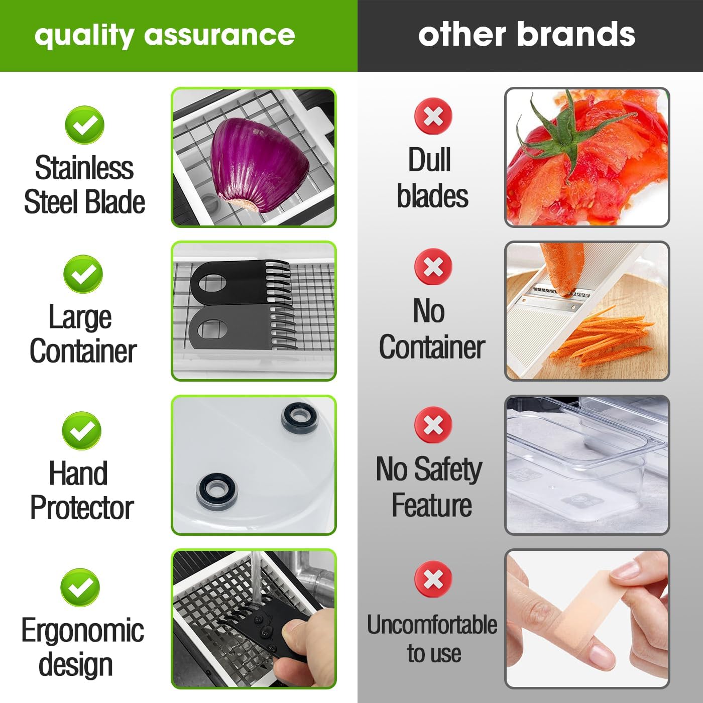 - Easy pre-meal preparation - Our vegetable cutter is a must-have tool in the kitchen. Everyone wants to eat healthier, but doesn't have much free time. Our cutters cut potatoes, tomatoes, cucumbers, carrots, etc., into small pieces with a strong, rust-proof blade. The stainless steel blade keeps the razor sharp, making the dicing crisper and smoother.