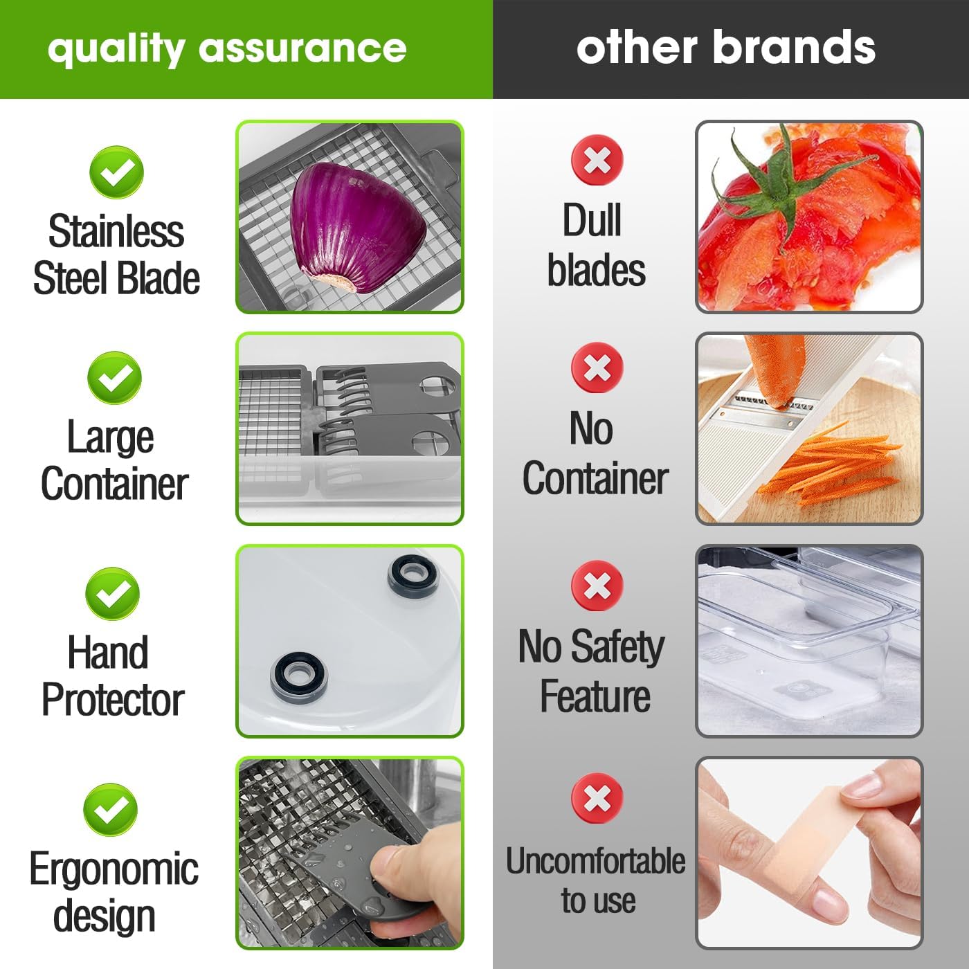 - Easy pre-meal preparation - Our vegetable cutter is a must-have tool in the kitchen. Everyone wants to eat healthier, but doesn't have much free time. Our cutters cut potatoes, tomatoes, cucumbers, carrots, etc., into small pieces with a strong, rust-proof blade. The stainless steel blade keeps the razor sharp, making the dicing crisper and smoother.