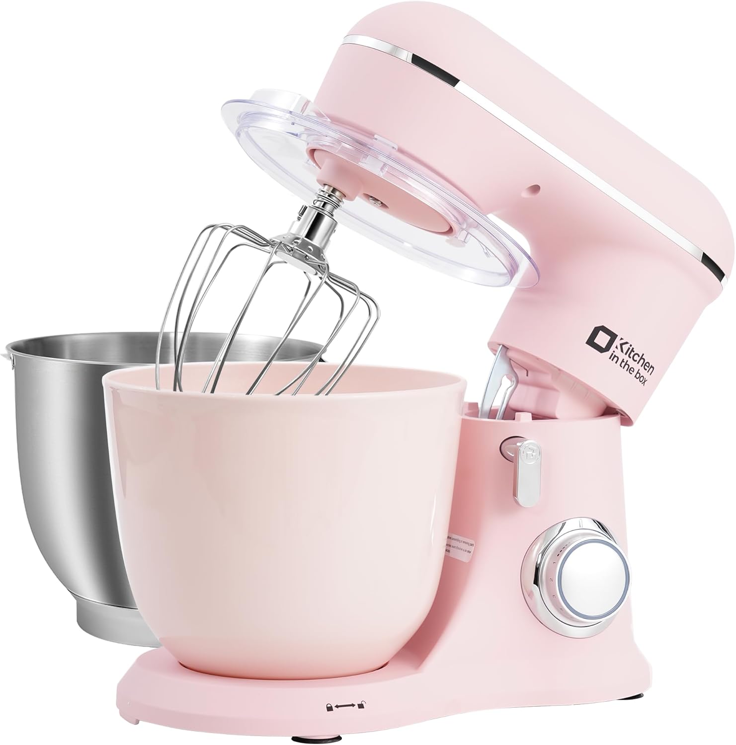 Kitchen in the box Stand Mixer, 4.5QT+5QT Two bowls Electric Food Mixer, 10 Speeds 3-IN-1 Kitchen Mixer for Daily Use with Egg Whisk,Dough Hook,Flat Beater (Rose Pink, 5QT)