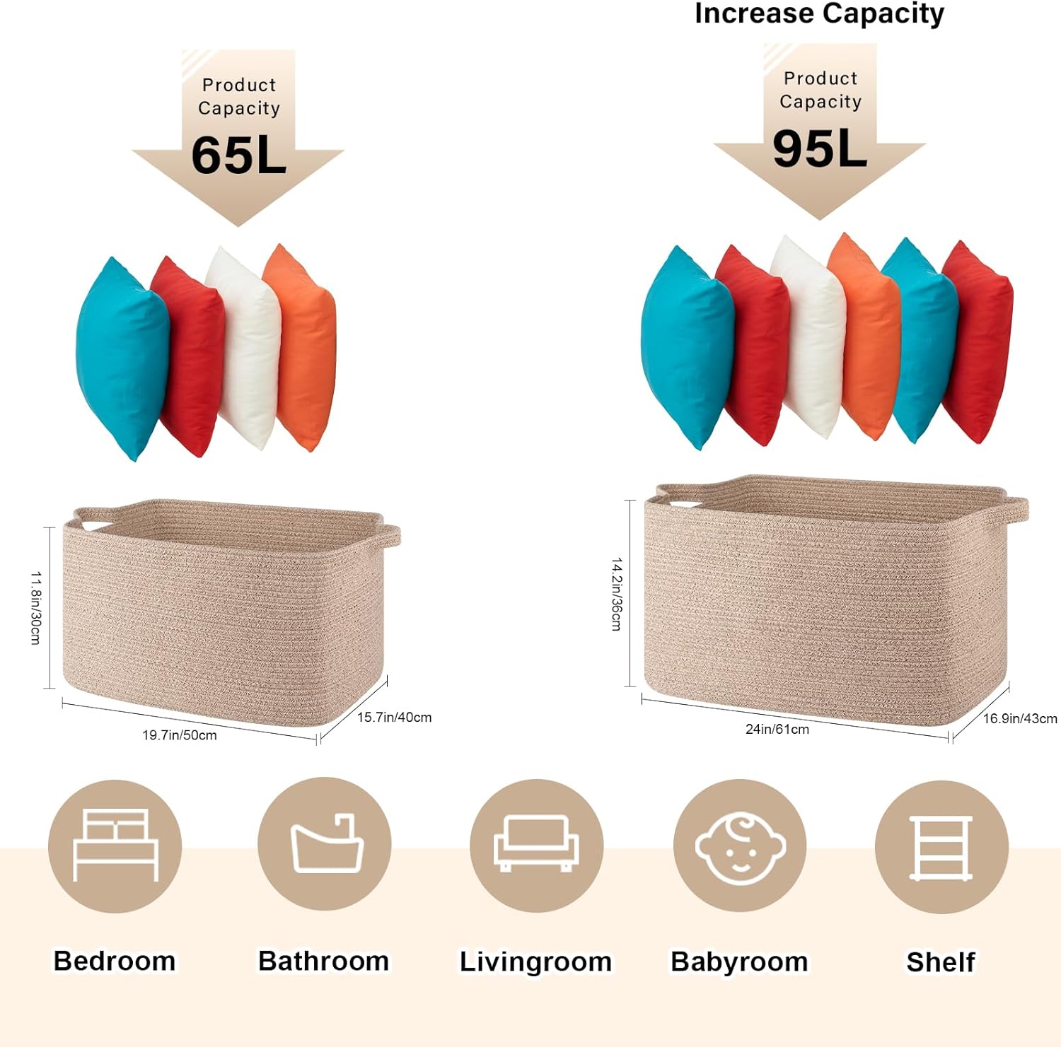95L Large Storage Basket, Cotton Rope Woven Blanket Basket, Toy Storage for Baby Room, Living Room, 24" x 16.9" x 14.2", Brown