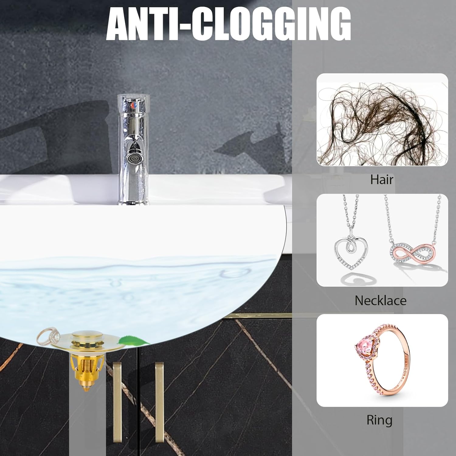 - 2 In 1 Design: The bathroom sink drain strainer has built-in spring that switches freely between pop-up and sealed states with touch. Best of all, it has an anti-clogging basket filter inside that prevents clogged drains such as hair, bracelets