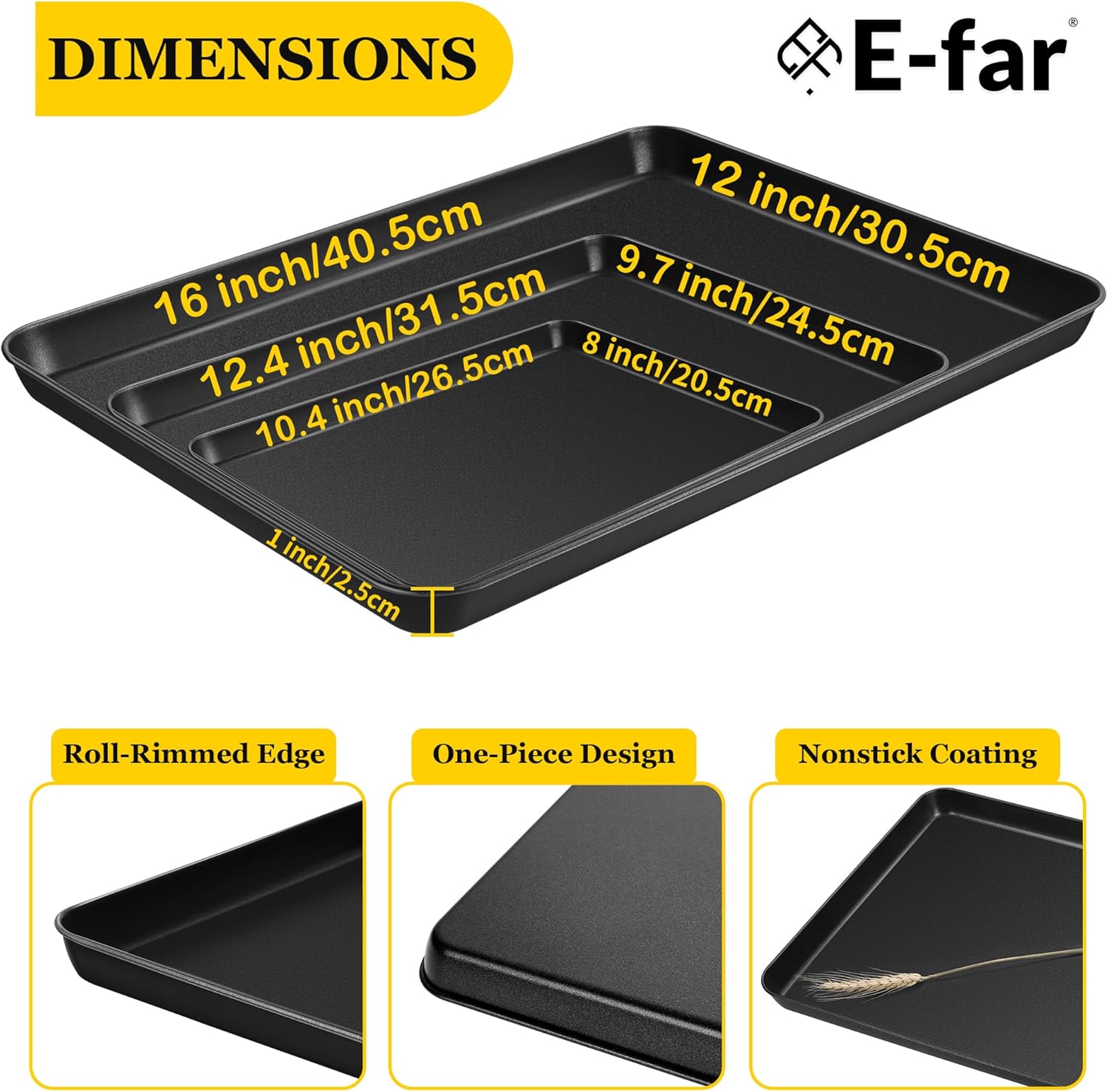 - PREMIUM MATERIAL BUILT TO LAST: E-far 3 pieces nonstick baking sheet pans made of good quality carbon steel core, Great alternative to aluminum sheet cake pans, Solid metal with sturdy construction for better rust resistance, Strong enough and not easy to break unlike glass baking dish, Premium material durable for years to bake and cook yummy food everyday