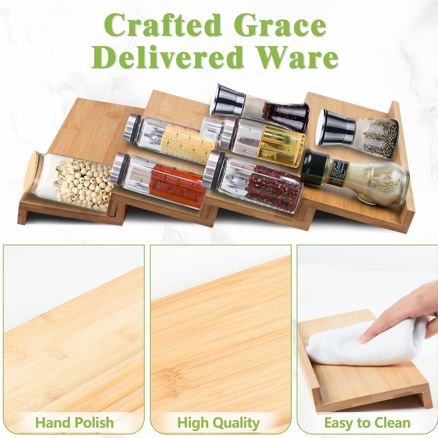 - Crafted Grace, Delivered Ware: Transform your kitchen with the Graceware bamboo spice rack drawer organizer. Designed with elegance and efficiency in mind, this kitchen organizers and storage will effortlessly tidy up your drawers. Its minimalist design ensures that your kitchen drawer organizer is space-saving and functional, maximizing accessibility. A must-have for every kitchen, the Graceware spice rack organizer for cabinet is the blend of beauty and practicality