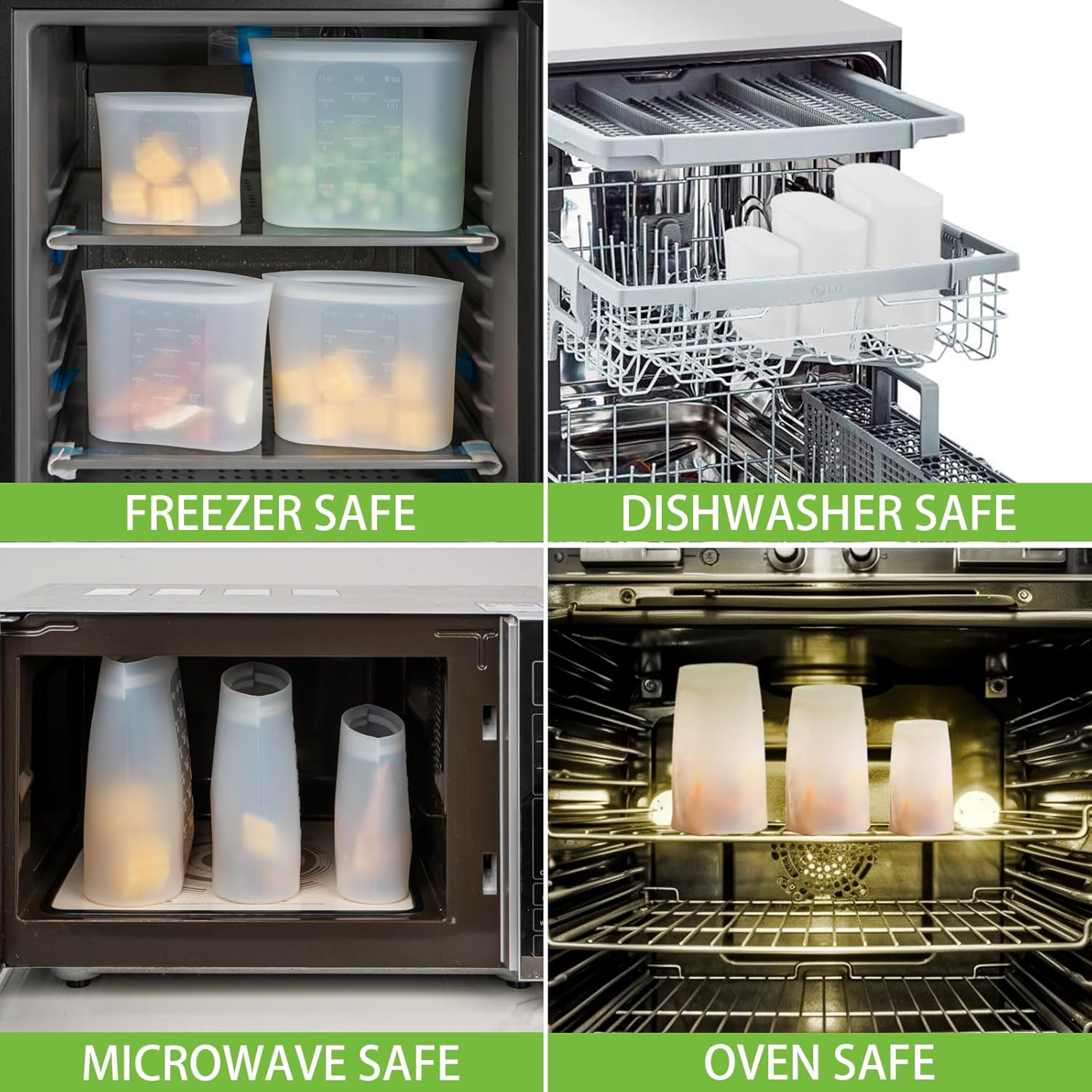 - 【DISHWASHER FREEZER MICROWAVE OVEN SAFE】Tired of dealing with plastic bags?(PEVA is actually a type of plastic.) Switch to silicone bags reusable storage and spend less time worrying about saving leftovers safely. These reusable bags are non-toxic and safe for use in the Microwave, Freezer, Oven and Dishwasher. They can even withstand temperatures up to 428℉, making them ideal for all your food storage needs