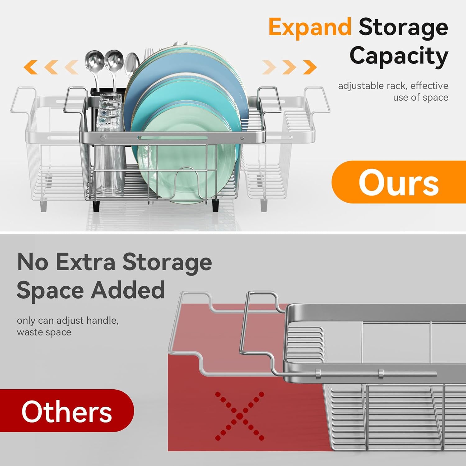 - REAL CAPACITY EXPANDABLE : Our over the dish drying rack is adjusting by the main body, unlike others only adjust the handles. This allows the Dish Drainers to be adjusted to fit your home's sink size while increasing dish storage space. You can use it in sink, over the sink or on the countertop.