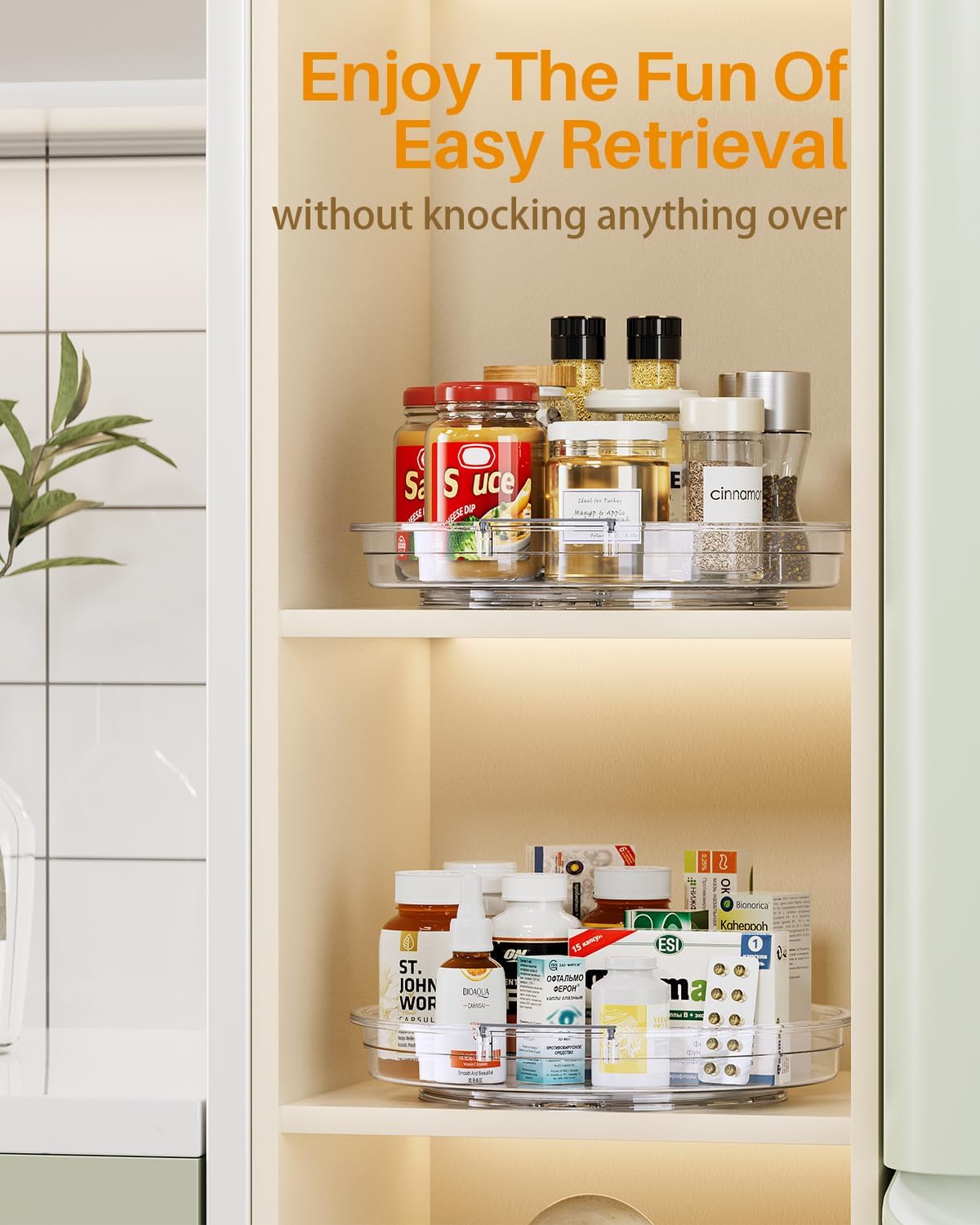 - 360° Rotating Organizer: Imagine easily reaching even the deepest items with ease! Our 10.6 in Lazy Susan turntable for cabinet simplifies access, there is no worry about knocking anything over. Perfectly for narrow cabinets and make your life more convenient
