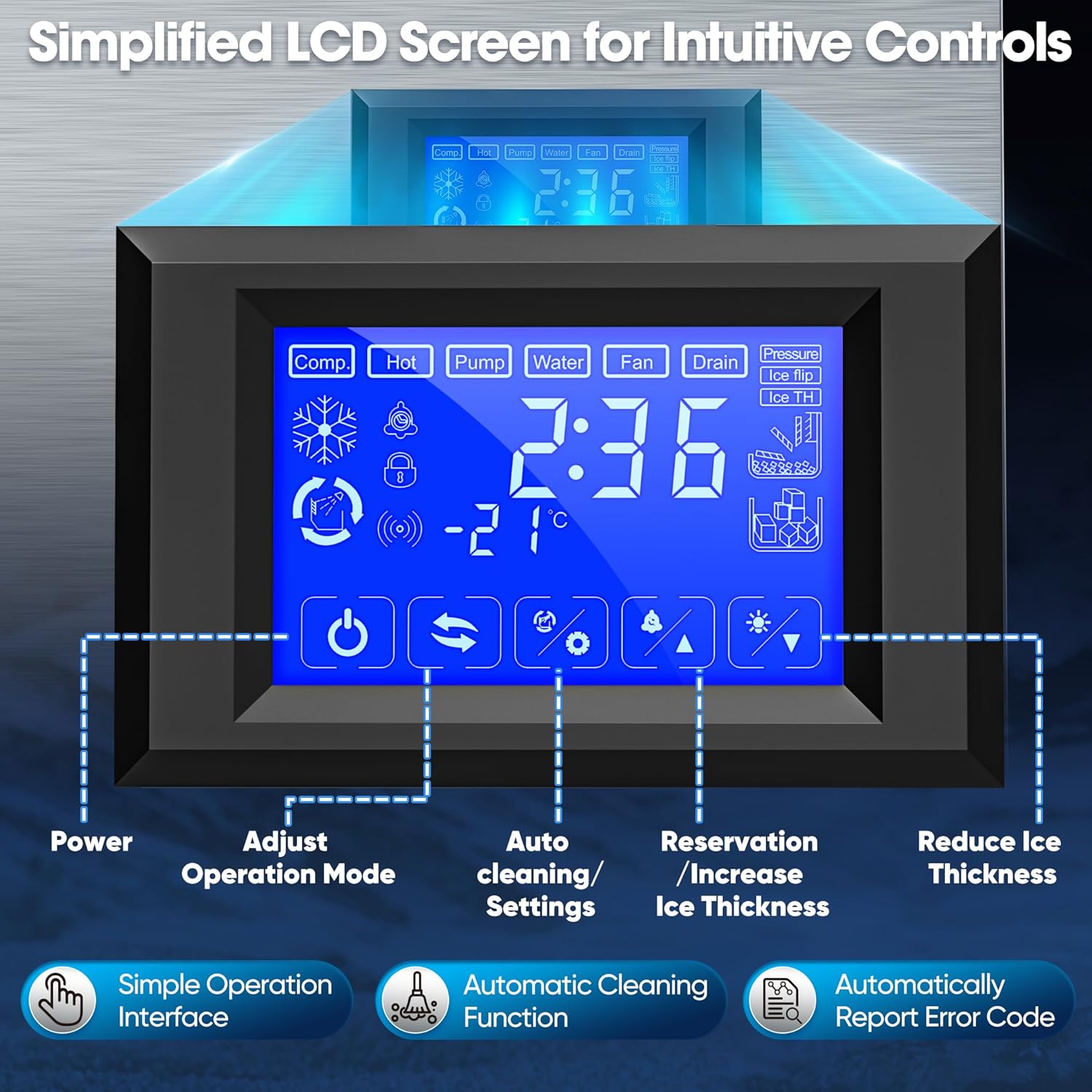 - [Simplified Screen Controller] Stay in control of your ice with Coolski commercial ice machine. With an easy-to-use LCD screen, adjust ice thickness, schedule ice-making, and activate the automatic cleaning with the touch of a button. Our industrial ice maker is designed with a built-in error code display, making it easy to troubleshoot and fix any issues.