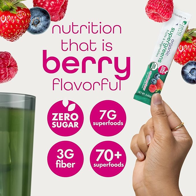 Zena Nutrition Organic Super Greens Powder, 70+ Superfoods, 0 Sugar, 3G Fiber, Spirulina, Chlorella, Antioxidants, Prebiotics/Probiotics, Digestive Enzymes, Mixed Berry, 30 Drink Mix Packets
