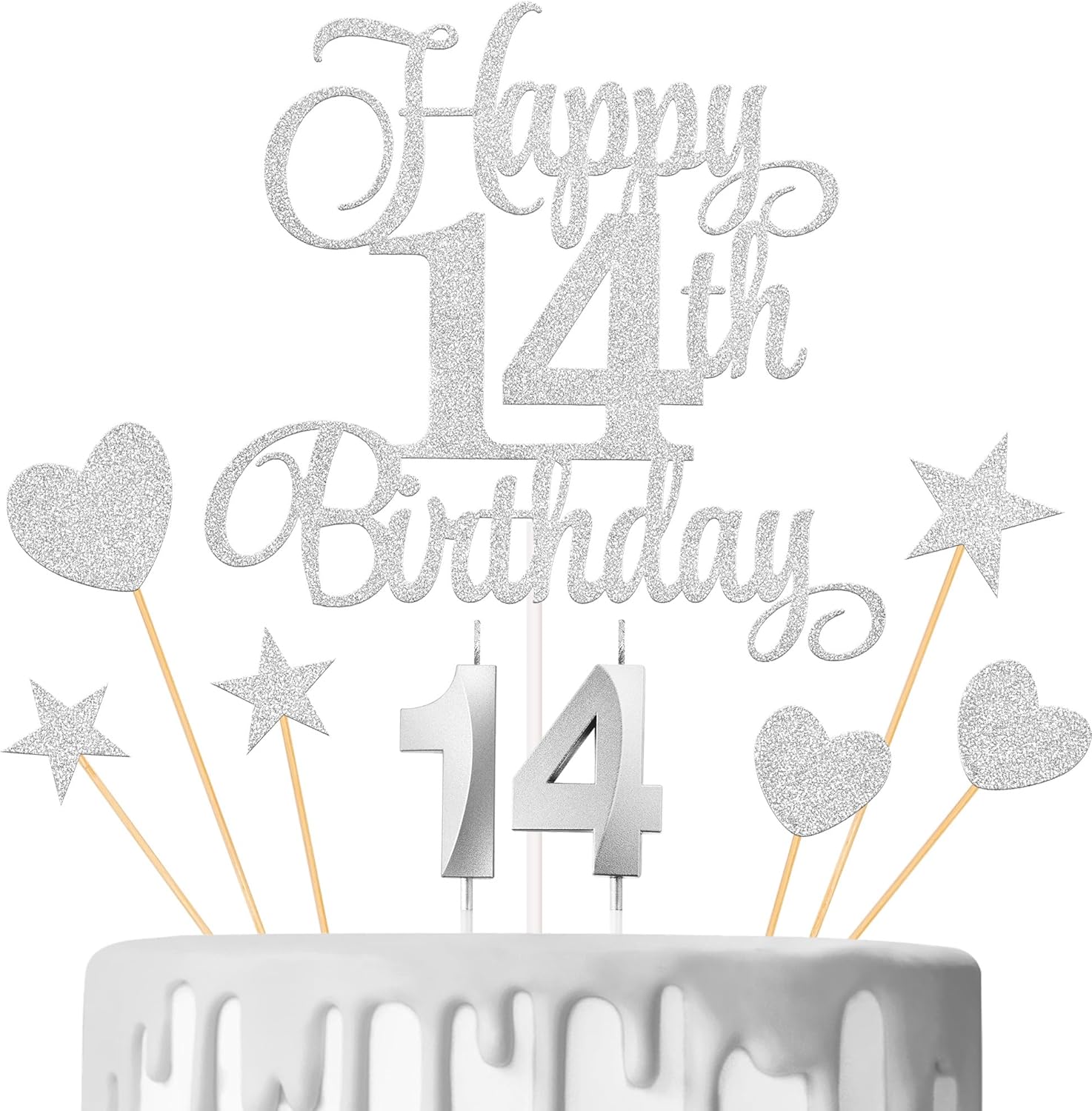 - Package content: you will receive 1 piece happy 14th birthday topper, 3 pieces star cake toppers, 3 pieces heart cake toppers and 2 pieces numeral candles, it's a great addition to the 14th birthday party and anniversary party