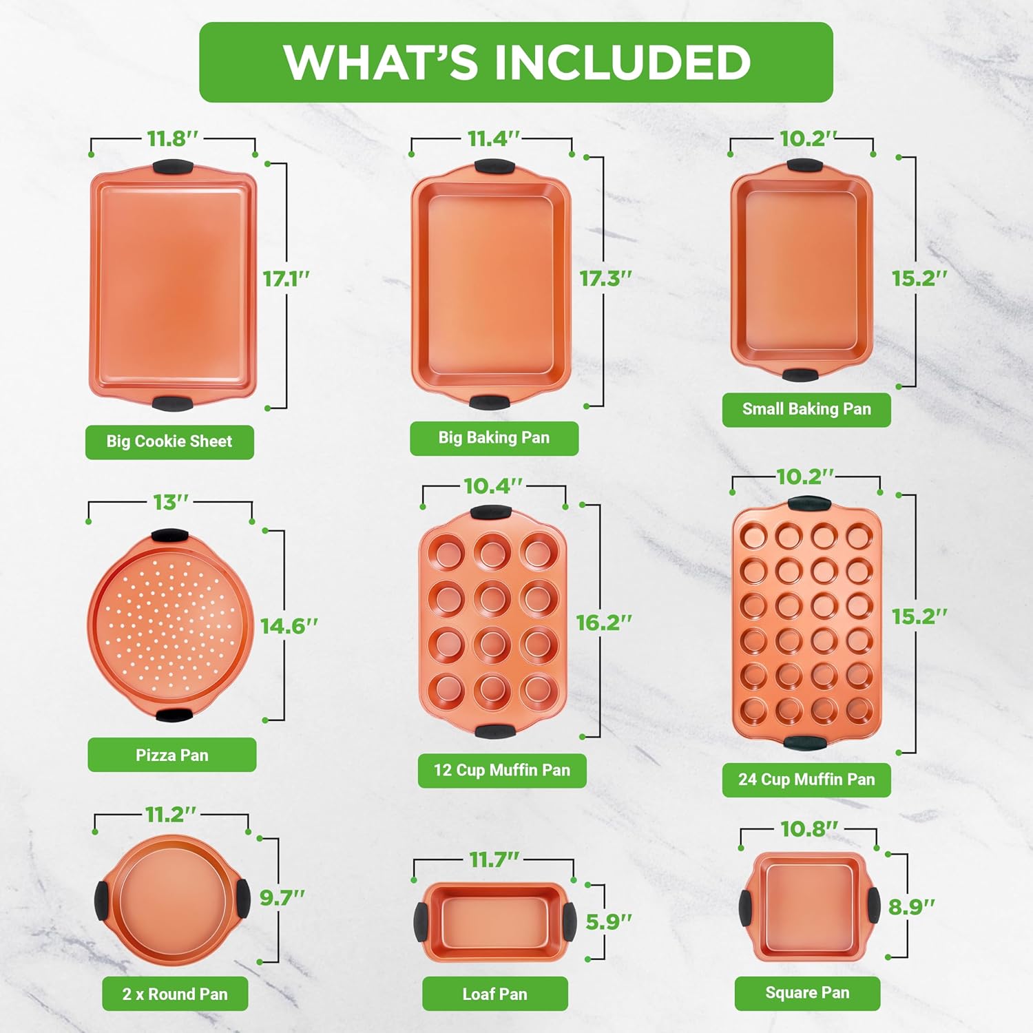 - COMPLETE SET FOR BAKING: This 10-piece baking pan set includes everything you need for cakes, loaves, muffins, pizzas, and more. The set has baking pans, pizza pan, small cookie sheet, round pans, square pan, loaf pan, and a 12 and 24 cup muffin pan.
