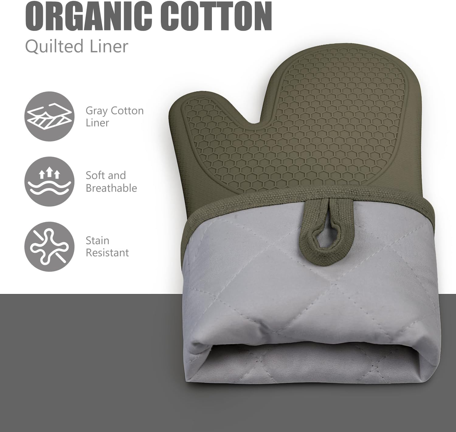- Unlike other oven mitts using recycled cotton, our mitt's quilted liner is made of premium natural cotton and offers great control and comfort without sacrificing dexterity. It provides good protection and comfortable touch for your hand till your forearm and has good stain resistant thanks to the gray color liner fabric design.