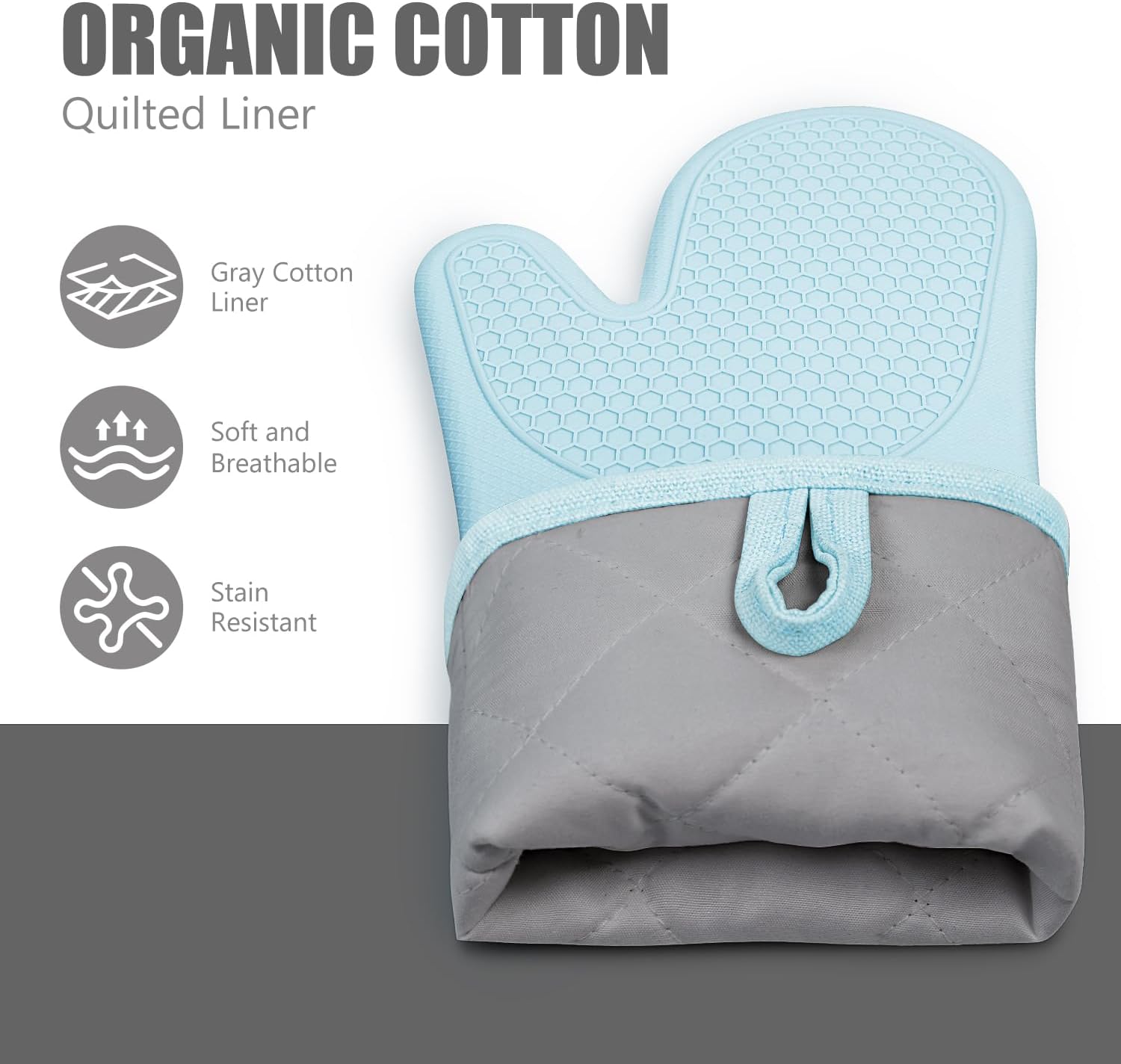 - Unlike other oven mitts using recycled cotton, our mitt's quilted liner is made of premium natural cotton and offers great control and comfort without sacrificing dexterity. It provides good protection and comfortable touch for your hand till your forearm and has good stain resistant thanks to the gray color liner fabric design.