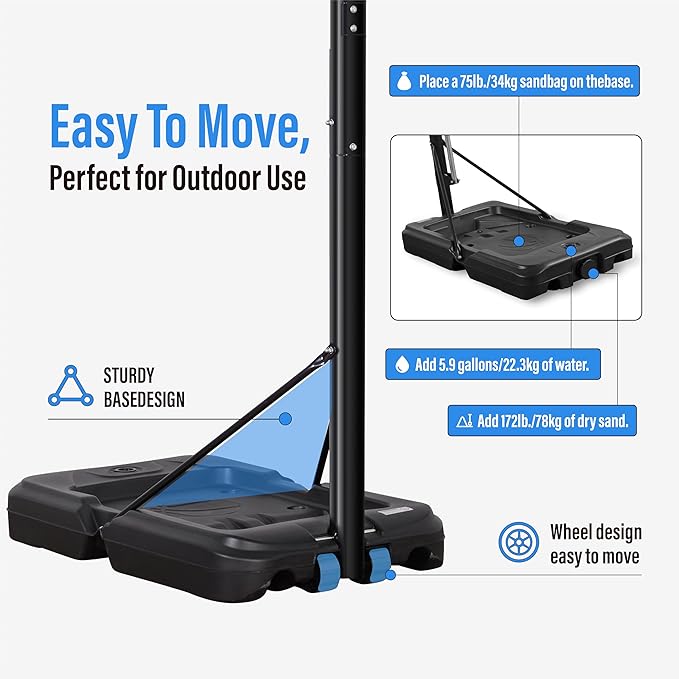 • 【STURDY BASE & PORTABLE】The portable basketball hoop is equipped with a robust and stable base triangular support structure. The high-strength PE base needs filling with water and sand to ensure stability and safety for every shot. The base is built in two wheels making it easy to move by one person. You can place it in backyards, courts, poolsides, gyms, and other indoor and outdoor places.