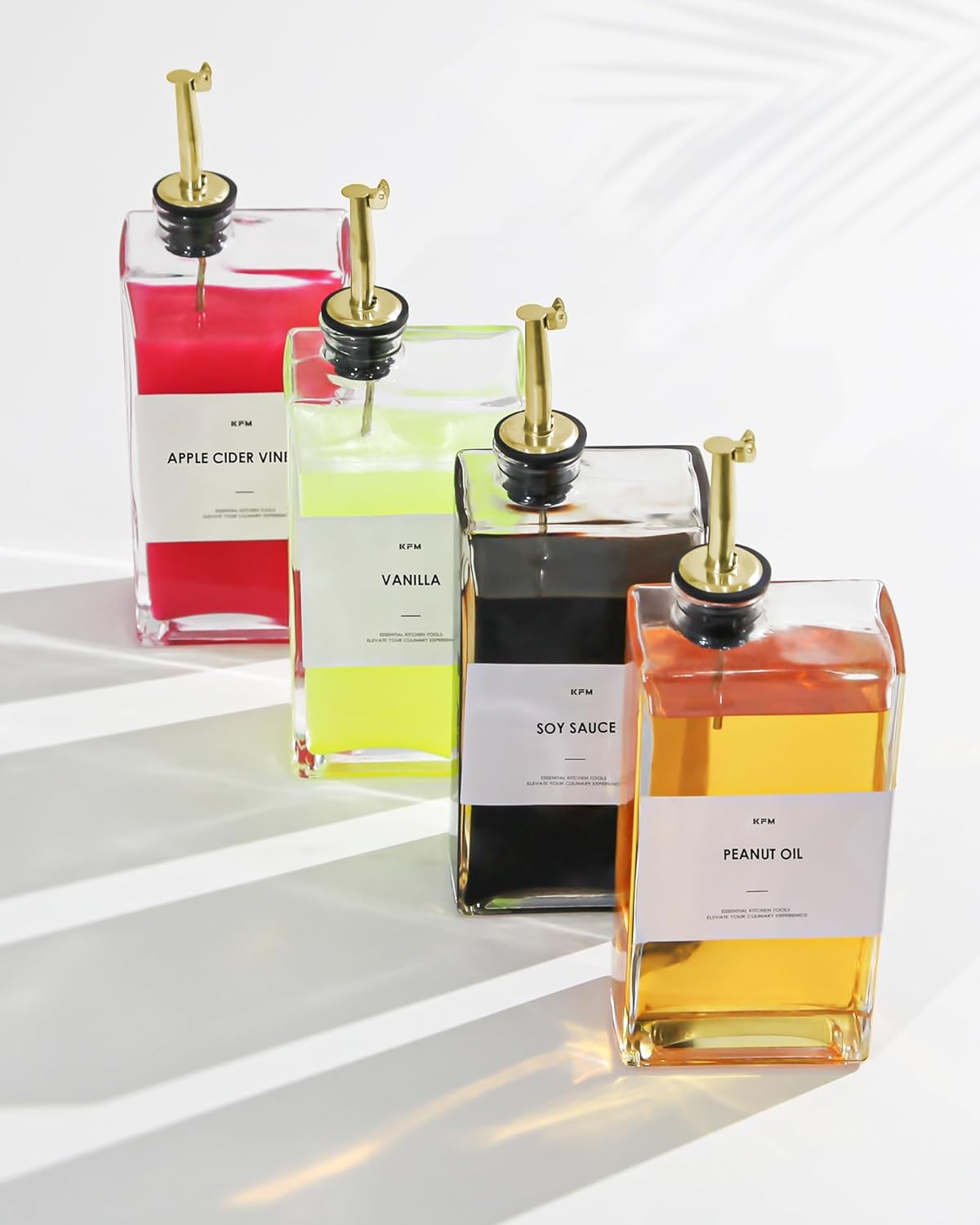 - [12OZ/350ML Large Capacity Oil Dispenser Set]: With elegant rectangular olive oil dispenser bottle set enhance your kitchen decor also very pragmatic. This set includes two high-quality 12 oz (350 ml) glass bottles, four gold pourers, a funnel, and 35 designed labels and 5 blank labels for your custom use.