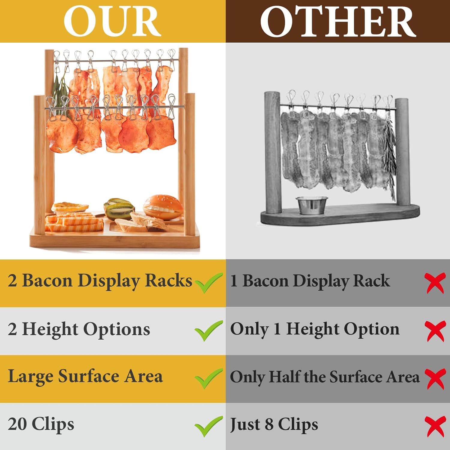 - Upgraded Serving Platters and Trays: This upgraded cheese board set includes a larger 11.8x9.8-inch platter, along with two bacon racks of different heights to accommodate various meat sizes. The bamboo platter is 0.79 inches thick, offering superior quality and sturdiness compared to similar products. With a total of 20 bacon clips, it allows you to fully unleash your creativity and create personalized displays.