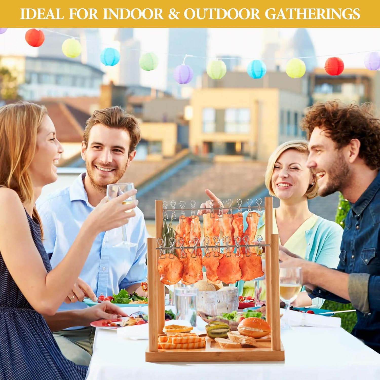 Bacon Display Rack with Clothesline Serving Tray, Patented Design Bacon Serving Dishes and Extra Double Hangers, Exquisite Holder for Housewarming, Home Party, or Wedding Gifts (Natural Bamboo)