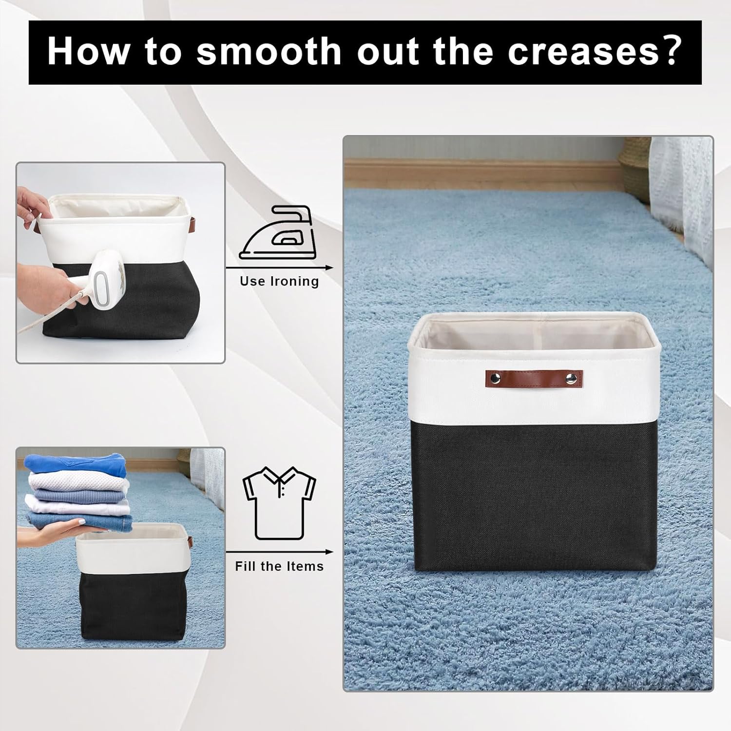 - 【Maintenance & Care Tip】 - Collapsible design for space saving. Our foldable baskets comes in a compression packing which may result in wrinkled storage bin during the long transit. Get rid of the wrinkles by either stuffing the fabric storage bins with blankets and pillows for a few days or steam iron them at low-heat setting. The organization baskets are easy to clean, you can dust the basket with a soft cloth with light soapy water when needed. Not recommended to machine wash.