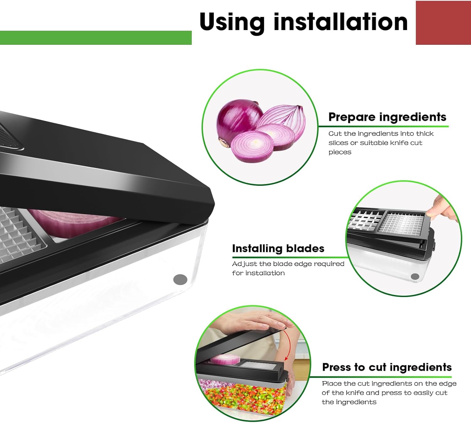- SUPERIOR QUALITY: Professional multifunctional vegetable chopper slicer can chop and dice and more, all in one versatile kitchen gadget. Made of high quality materials, such as high quality stainless steel blades and food grade materials. A perfect tool for yourself or anyone who loves to cook.