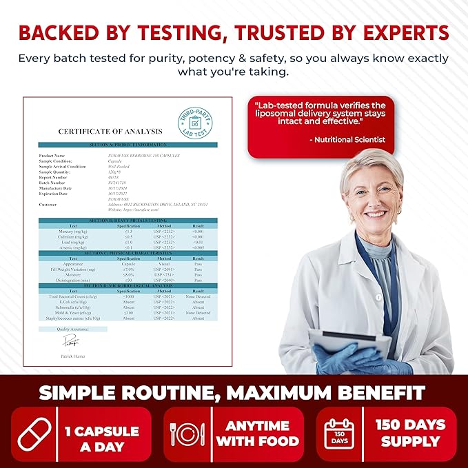 • Outstanding 5-Month Berberine Supply: This bottle holds 150 capsules, offering a convenient and straightforward 5-month supply to support your overall wellness journey