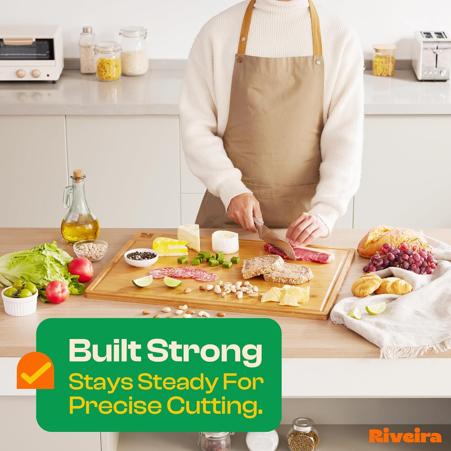 Riveira Brown Bamboo Wood Cutting Board – Gourmet Bamboo Grandeur: 24 x 18 Wooden Cutting Board – Wooden Cutting Boards For Kitchen Decorative – Innovative Juice Grooves Wooden Chopping Board