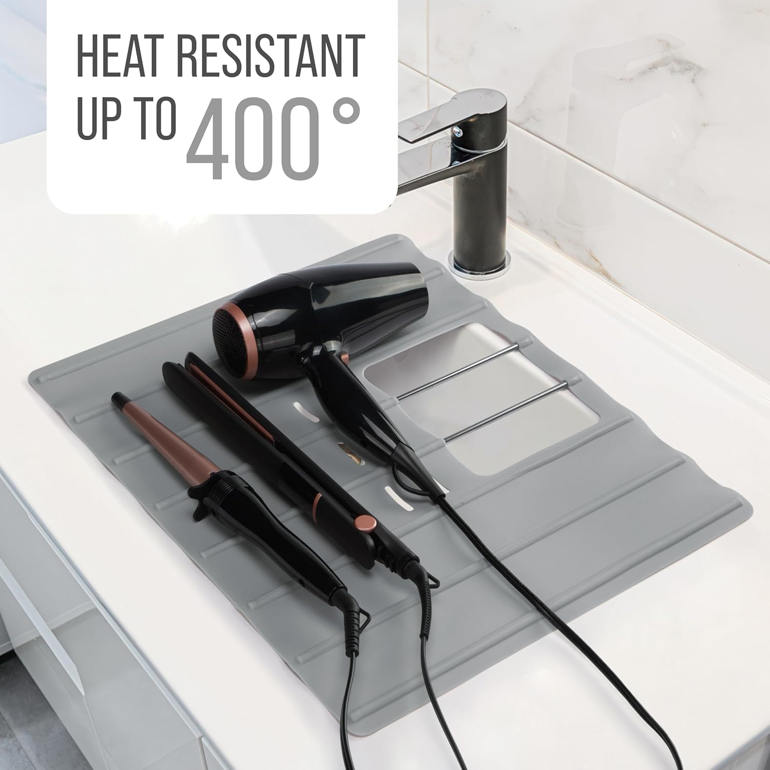 - Stands up to the Heat: Curl or straighten your hair without accidentally burning bathroom surfaces. Safely put your iron down on this bathroom sink mat that is heat resistant up to 400 degrees! Whatever style you’re after, this convenient bathroom sink cover for makeup is ready for anything