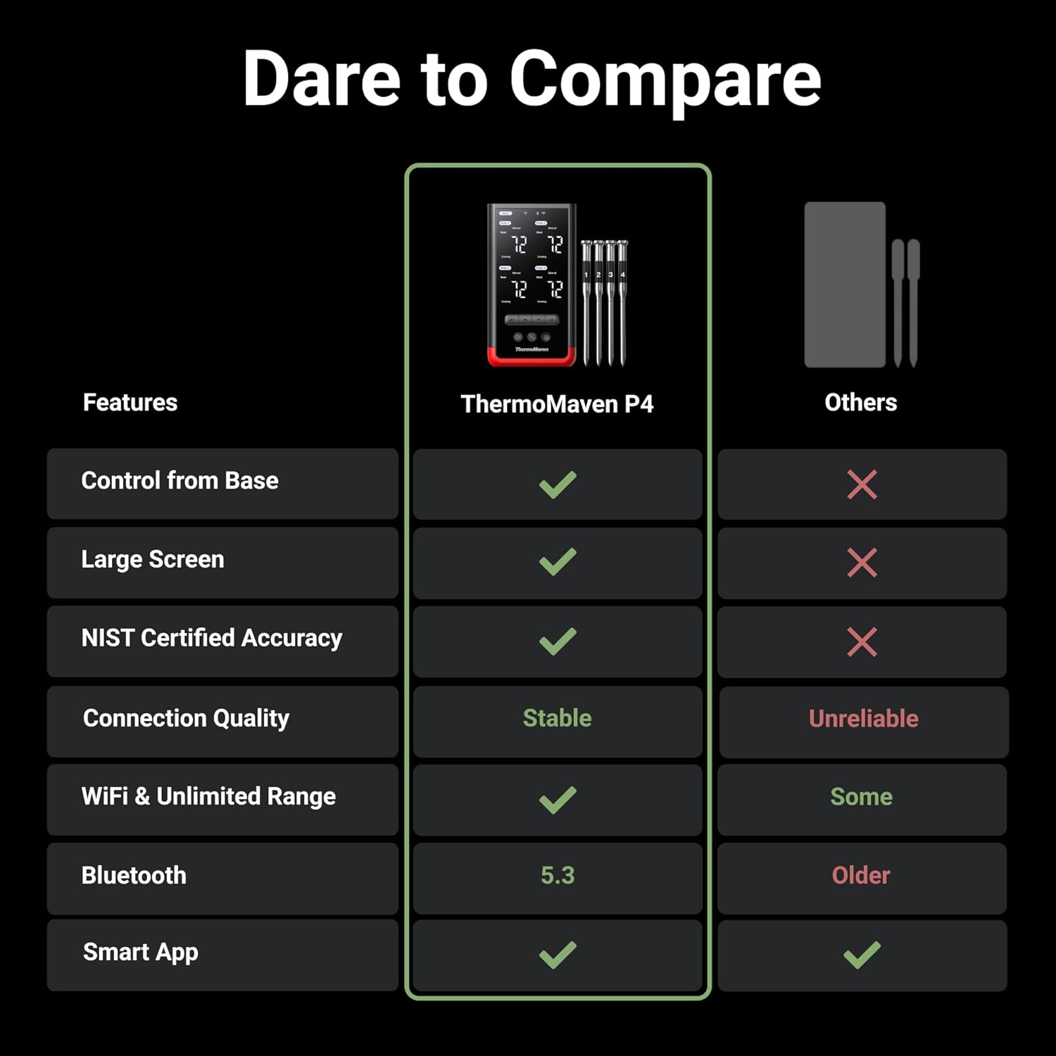 - Smart Display Base: Unlike other thermometers that require an app to function, the P4’s display base provides real-time readings and lets you set temperatures directly on the device. A smart app is also available, giving you the best of both worlds.