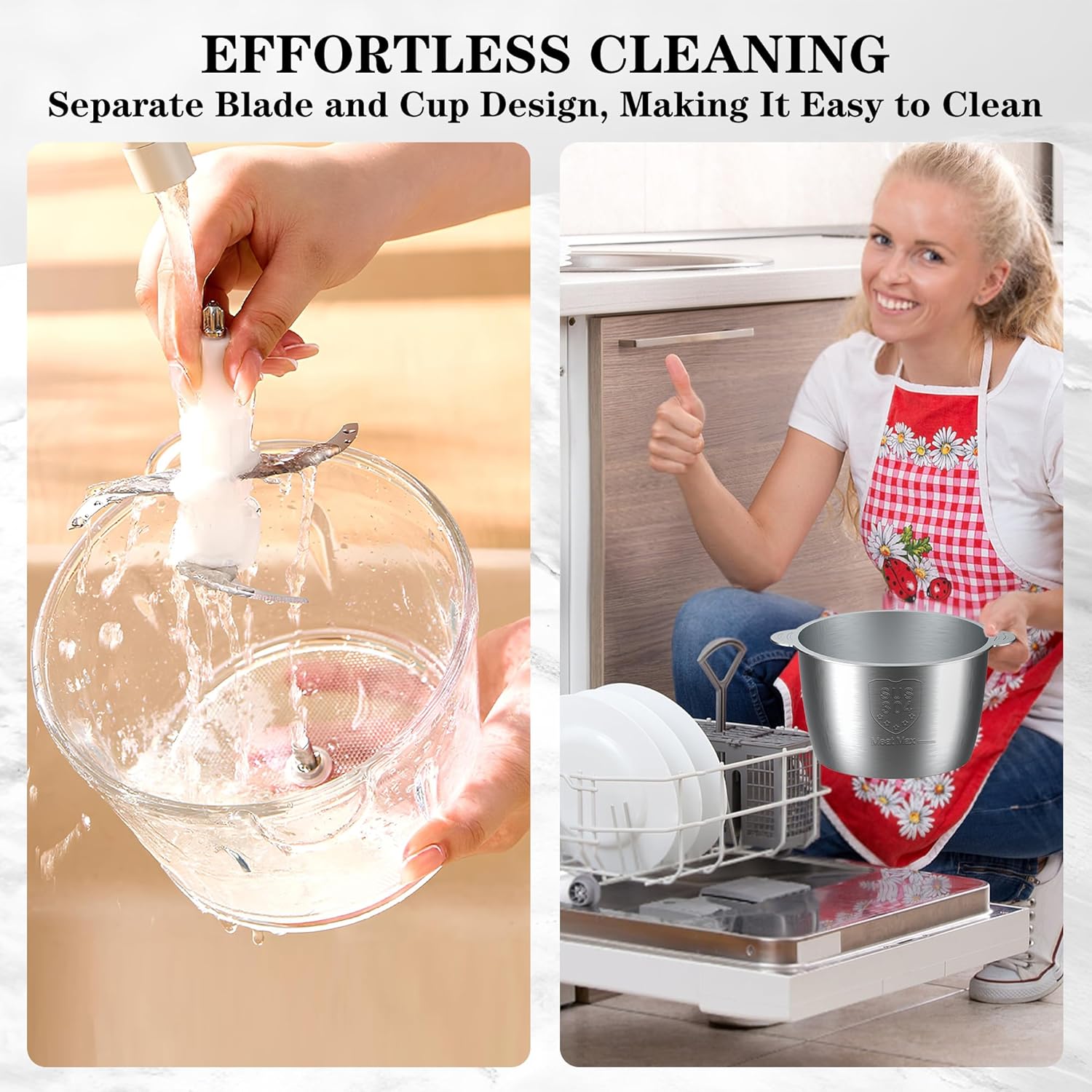 - 【Easy to Clean & Assemble】Assembling is quick.Removable blades detach instantly. Nesting design with dishwasher-safe bowls (tested up to 158°F/70°C) stacks neatly to save space. Wipe the motor base with a damp cloth—no disassembly needed.