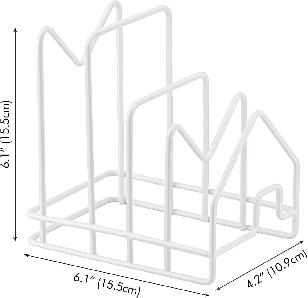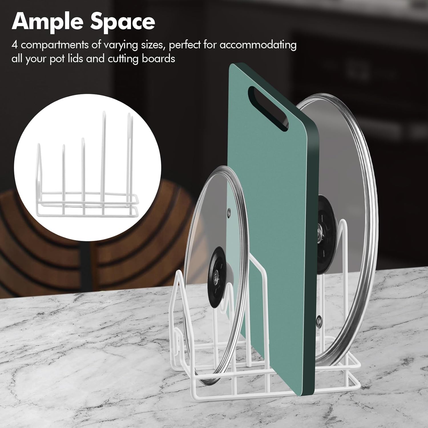 - Ample Space - Measuring 5.9" x 4.2" x 6.1", our bakeware rack features 4 compartments of varying sizes, perfect for accommodating all your pot lids and cutting boards.