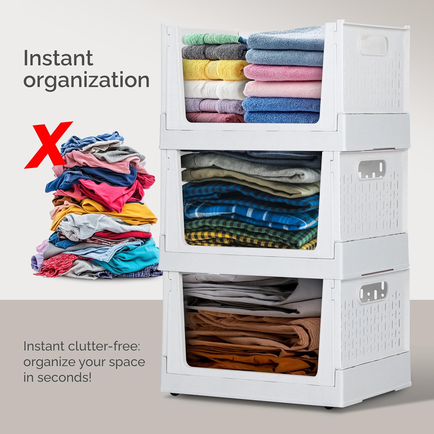 - [Space-Saving Design]: Optimize your storage space with stackable and foldable bins. When not in use, simply fold them down to free up space. The generous size accommodates a variety of items, and the snap design on both sides prevents tipping, ensuring your stacked bins stay securely in place.
