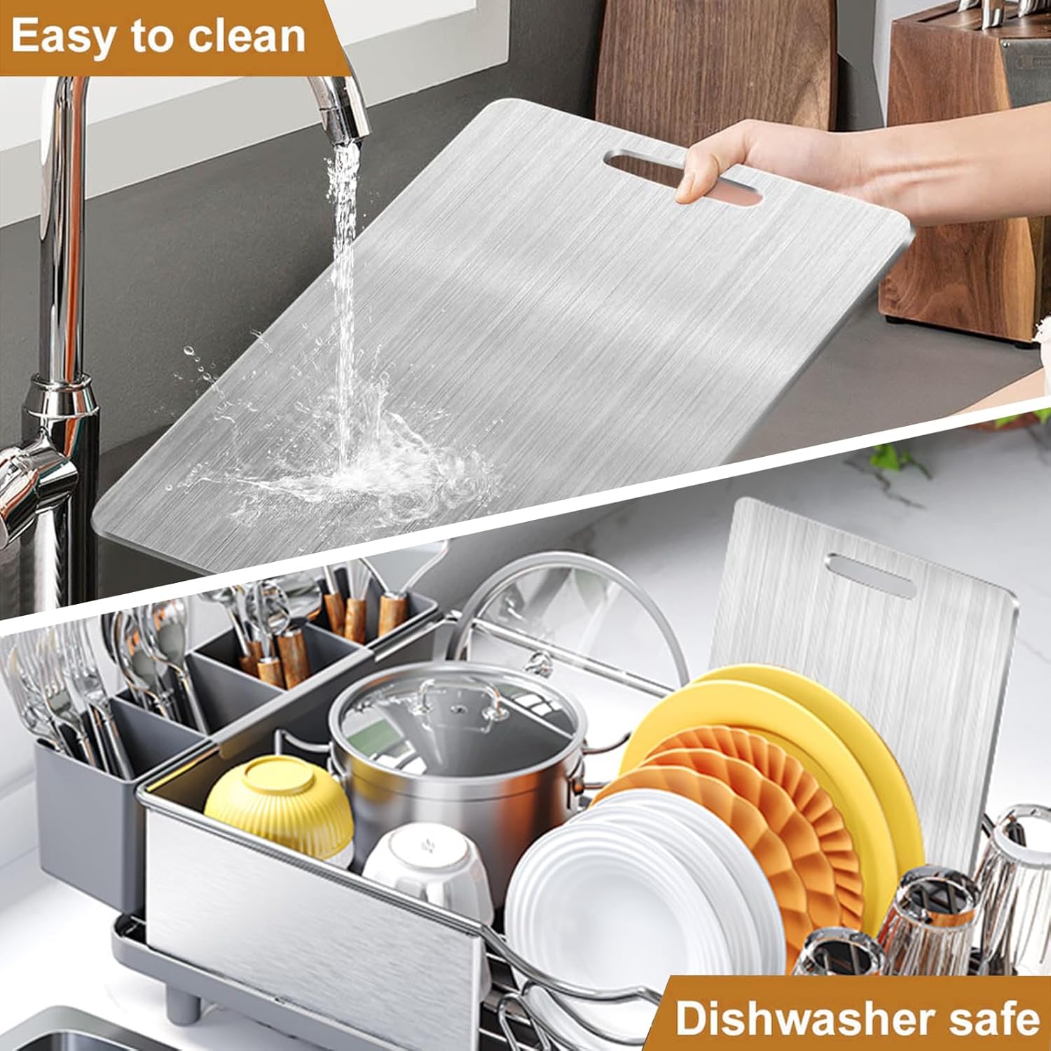 - 【Easy to Clean and Maintain】: The non-porous, smooth surface of the titanium board makes it incredibly easy to clean. Simply rinse with warm water and mild soap or place it in the dishwasher for a hassle-free clean-up.Enjoy the practicality of our Titanium Cutting Board, which not only provides a durable cutting surface but is also easy to clean and maintain, ensuring a hygienic kitchen environment.