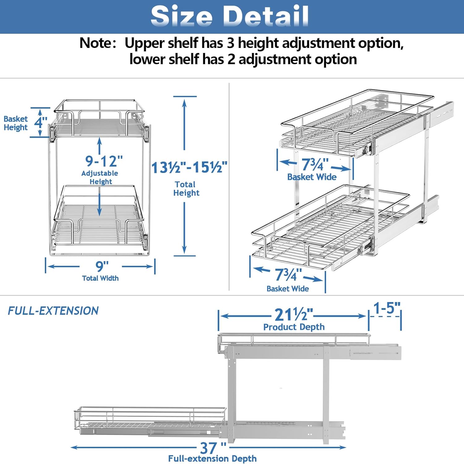 - 【Item Size】Organizer dimensions: 9"W x 21"D x 15"H. Fits 9½" cabinet openings and larger. Please measure your cabinet opening do not include the hinge width, just measure from hinge to opposite side. You can contact seller via Amazon Messages to make sure if the size fit your cabinet.